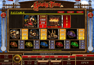 Описывая все характеристики азартного автомата Booty Time, можно сделать вывод, что слот действительно выгодный. В симуляторе имеется иконка разброса – сундук с золотом. По правилам для победы Вам нужно поймать минимум три таких иконки в любых местах на экране. Символ Wild – это изображение с названием аппарата. Количество линий варьируется от 1 до 25 штук, но желательно активировать сразу все полосы. Размер джекпота – 2500 монет. Лучше всего крутить барабаны по максимальной ставке. Современная функция авто вращений считается одним из преимуществ данной модели. Вам не нужно будет каждый раз нажимать на кнопку запуска барабанов, а все призы моментально прибавляются к основному балансу.